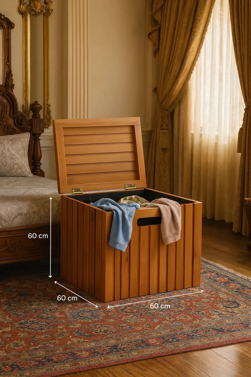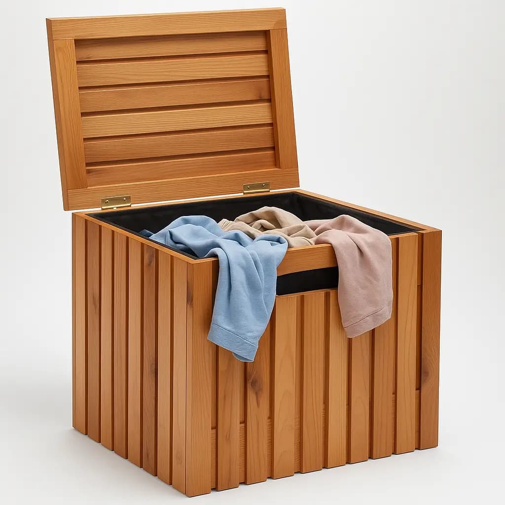 Organize your home in style with this beautifully crafted Wooden Laundry Storage Box. Designed with a modern slatted exterior and a smooth natural wood finish, this box adds a touch of elegance to any bedroom, bathroom, or laundry area.
